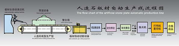• 产品简介: 该产品专用于人造石板材的生产制造,产品采用PLC程序自动控制,各种板材在制造过程中的浇注、定型、脱模、锯断经生产线自动完成,该生产线以技术优势确保高效制造出优质的人造石板材。